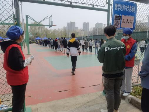 每位同学间隔1米排开,戴好口罩、手持身份证,准备迎接一天的检测。