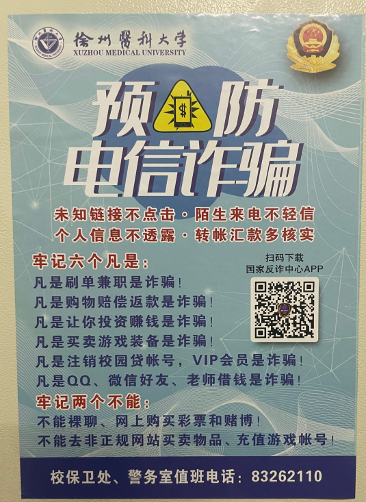 在学院各宿舍全部张贴反诈宣传海报,深入宿舍,课上课下不间断,全面加强防诈骗意识。