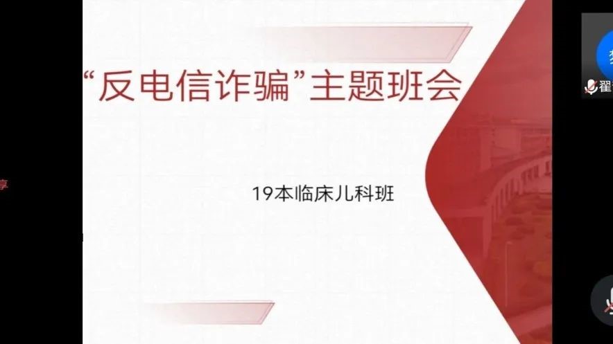 全院各个班级通过线上会议开展反诈主题班会,通过播放防诈骗视频、讲解防诈骗PPT的形式进行科普各项知识。